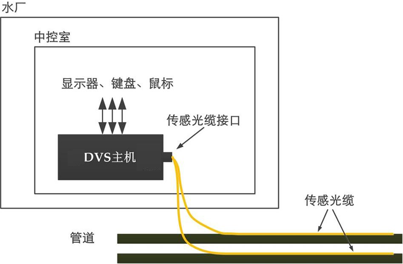 在水廠的中控室(或類似設(shè)備間)內(nèi)放置 DVS 主機(jī),并連接顯示器、鍵盤、鼠標(biāo), 供給 220V AC 市電,開機(jī)使其正常運(yùn)行。將沿管壁貼敷的傳感光纜從地下管道處引入水廠內(nèi)、導(dǎo)入中控室中,選取光纜中的一芯熔接 FC/APC 跳線后,插入 DVS 主機(jī)的傳感光纜接口。運(yùn)行 DVS 泄漏在線監(jiān)測軟件,系統(tǒng)正常運(yùn)行,可實(shí)時在線監(jiān)測管線各處的泄漏情況。