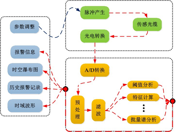 光學(xué)系統(tǒng)產(chǎn)生極窄線寬、功率適當(dāng)?shù)奶綔y脈沖,將探測脈沖注入傳感光纖并同時接收傳感光纖中返回的瑞利后向散射光,進(jìn)行光電轉(zhuǎn)換,提供原始的擾動傳感信號。嵌入式控制系統(tǒng)和后臺軟件系統(tǒng)對傳感數(shù)據(jù)進(jìn)行存儲、處理、計算、傳輸、交互。嵌入式控制系統(tǒng)通過數(shù)據(jù)采集設(shè)備將光探測器輸出的模擬擾動傳感信號轉(zhuǎn)換為數(shù)字信號,交付后臺軟件系統(tǒng)進(jìn)行實(shí)時處理。后臺軟件系統(tǒng)讀取傳感數(shù)據(jù)后,進(jìn)行預(yù)處理、濾波、批量 FFT 分析、特征量計算、閾值分析等,提供擾動數(shù)據(jù)的處理結(jié)果。交互系統(tǒng)將后臺軟件系統(tǒng)的處理結(jié)果實(shí)時顯示給用戶查看,包括報警信息、擾動曲線、時域波形、時空瀑布圖、調(diào)閱歷史報警記錄、查看歷史波形等功能,并可根據(jù)用戶的輸入,對系統(tǒng)的空間分辨率、脈沖重復(fù)頻率、探測脈沖寬度等參數(shù)進(jìn)行適當(dāng)調(diào)整。